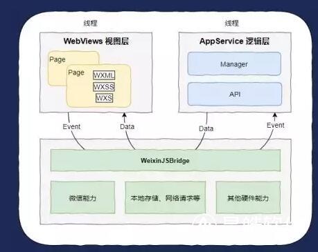小程序的開(kāi)發(fā)模式是一種類 Web的模式,它的前端和一般的 H5的前端相似,但和 JavaScrpit開(kāi)發(fā)比起來(lái)的會(huì)簡(jiǎn)單很多,這點(diǎn)得益于小程序的實(shí)現(xiàn)原理和架構(gòu)。下圖是程序的基本架構(gòu)圖,它的上層分兩個(gè)板塊,一塊是視圖層,也是 WebViews,另一塊是邏輯層,也就是 AppService,這兩層在兩個(gè)不同的線里面進(jìn)行處理,跟傳統(tǒng)的 web有根本性的差異。