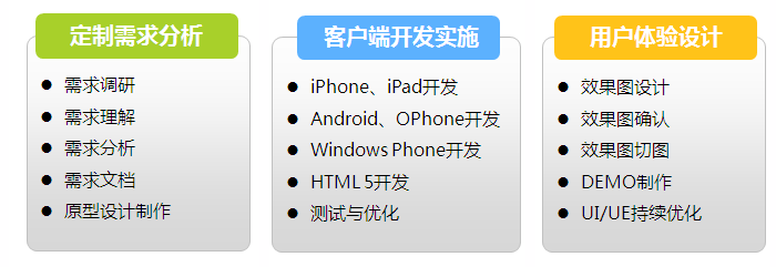 | iOS、Android、Windows Phone等操作系統(tǒng)的手機應用開發(fā)服務。每個開發(fā)團隊成員都有幾年的手機操作系統(tǒng)開發(fā)經(jīng)驗,能夠更快更準確地為每一位客戶進行手機定制,為每一位手機用 戶提供最全面的服務。 | |