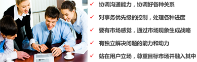 | 處理各種復雜的關系和工作,具備良好的市場洞悉能力,溝通能力,組織協(xié)調能力,資源運用能力,推動和協(xié)調各部門的合作和有序進展。 | |