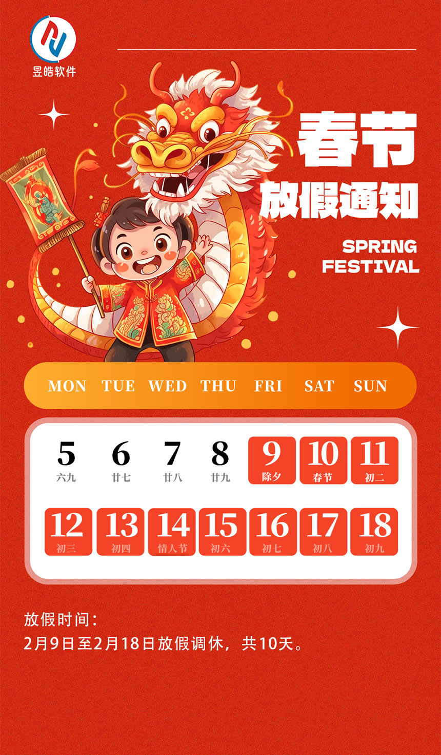 2月9日(星期五)至2月18日(星期日)放假調(diào)休,共十天。2月19日(星期一)上班。